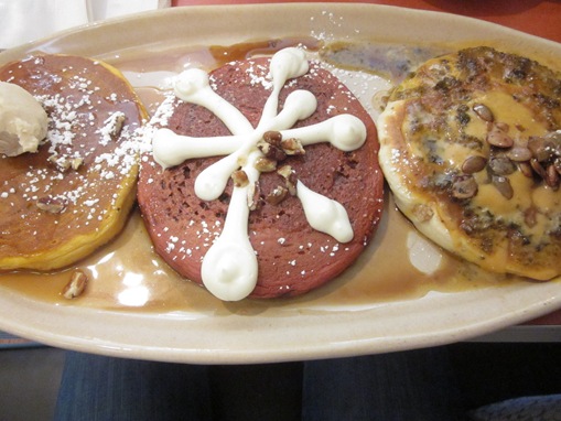 Red-Eye Velvet Pancakes Red velvet buttermilk batter topped with espresso infused maple syrup, a touch of cream cheese frosting and chopped pecans.