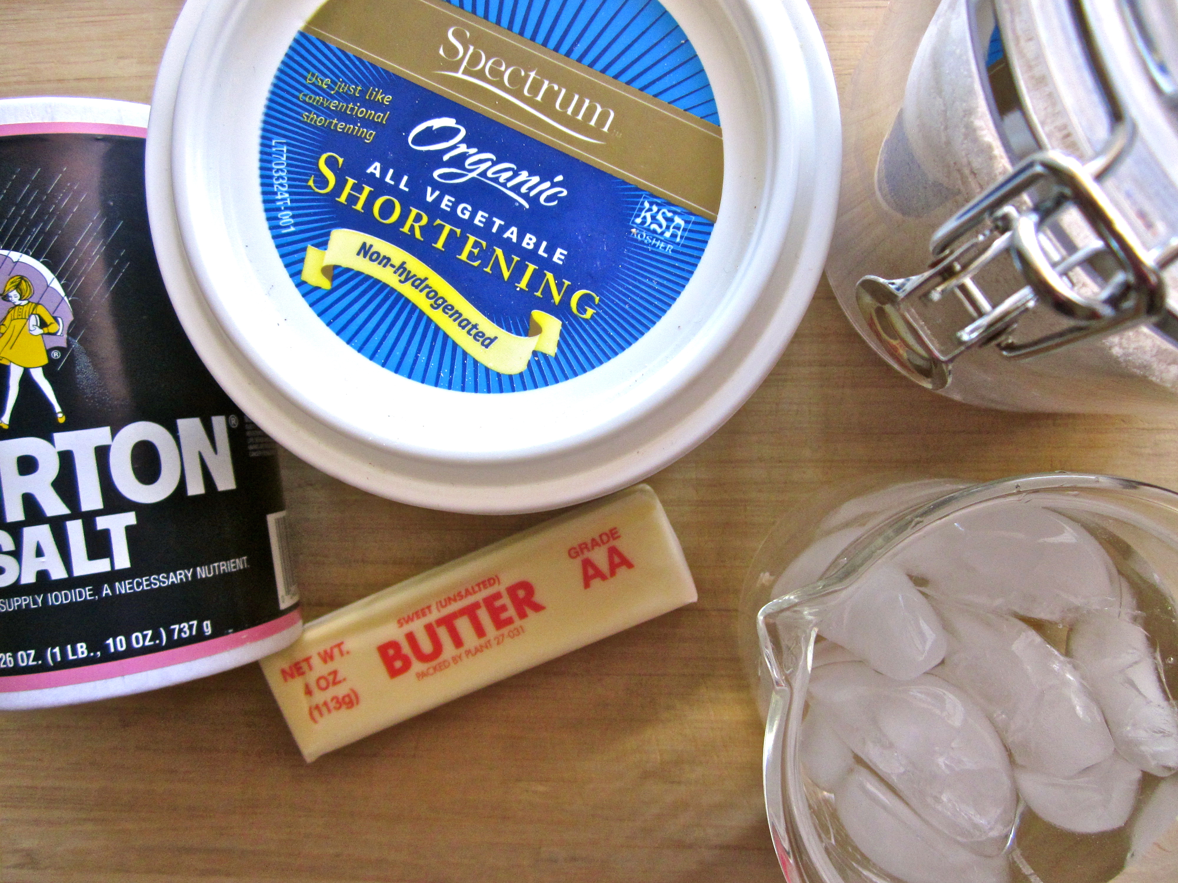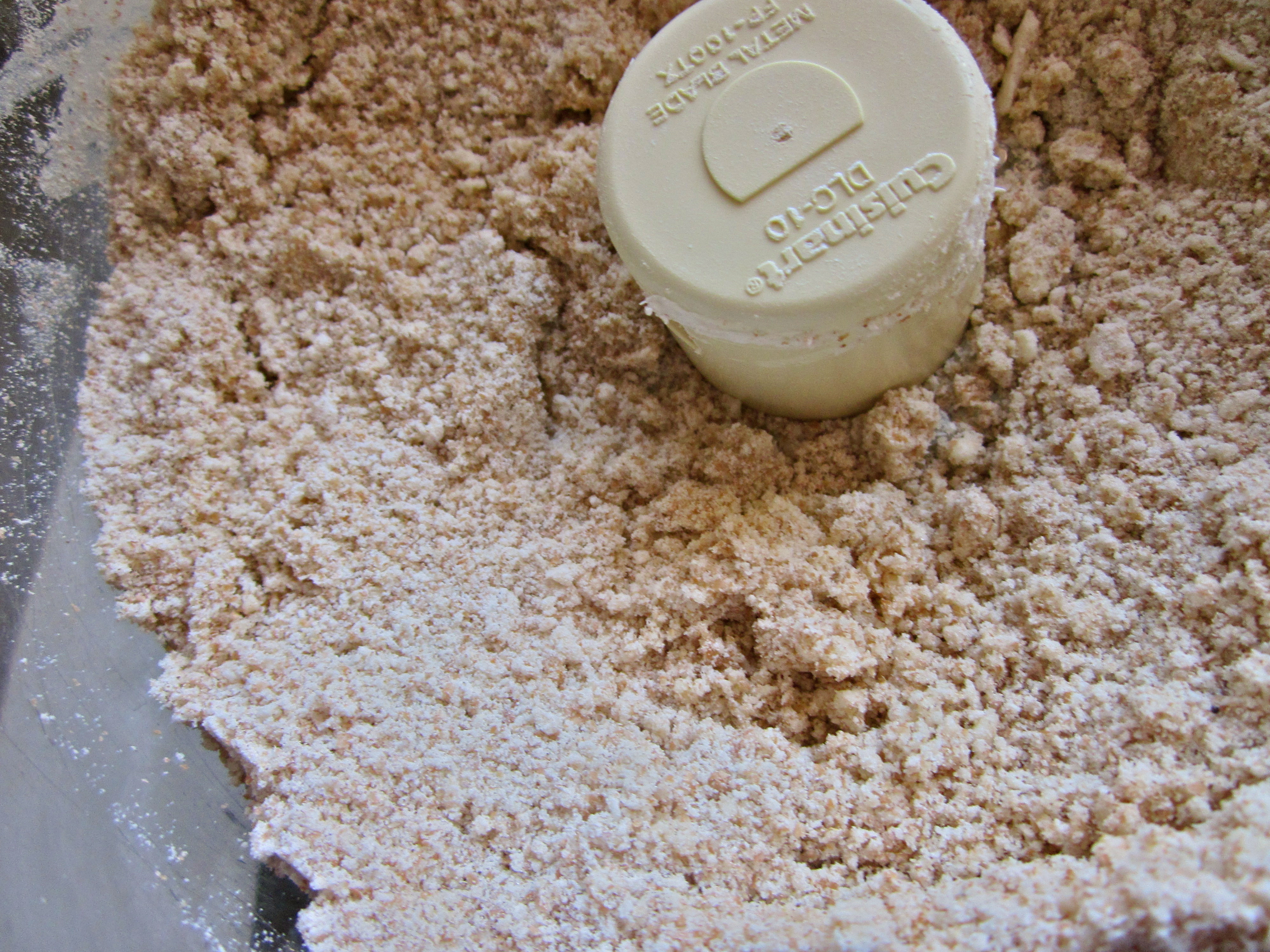 - Add flour, butter, shortening and salt to a Cuisanart and pulse until texture of coarse meal.