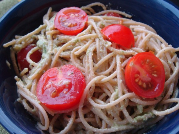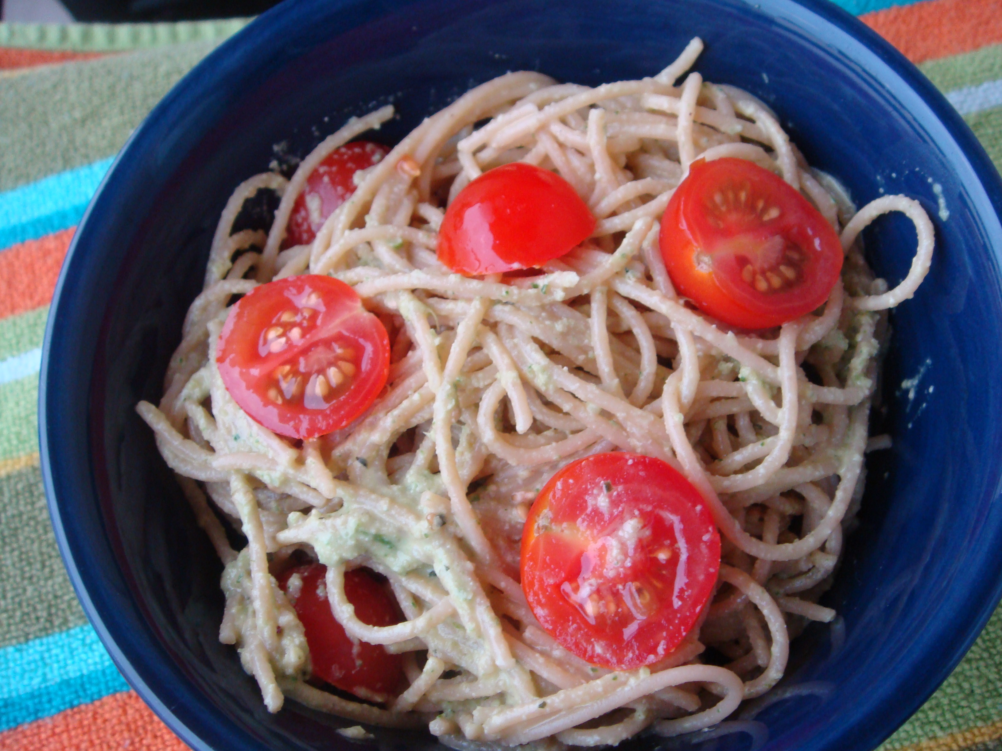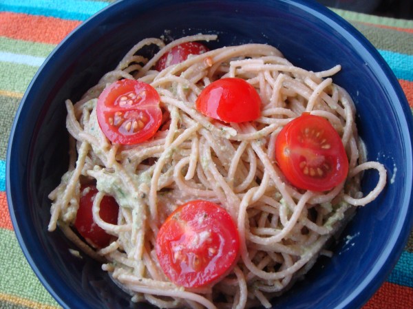 I reserved about a cup of the pasta water before draining so I could thin out the pesto. Note to self: Thin out pesto BEFORE adding it to the pasta, duh! I chopped some cherry tomatoes in half to add to the pasta as well.