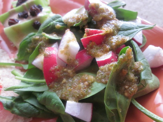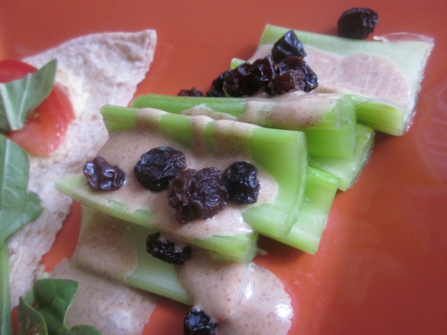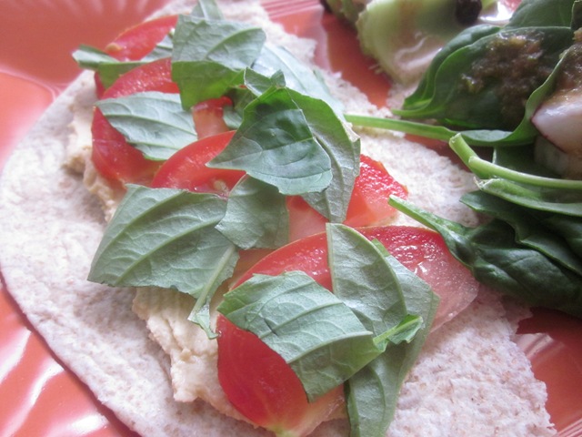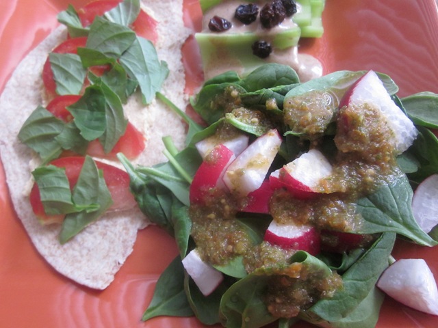 Last half of a tortilla with hummus, tomato and basil + salad with radishes and tomato-cilantro vinaigrette + celery drizzled in almond butter sauce and raisins.